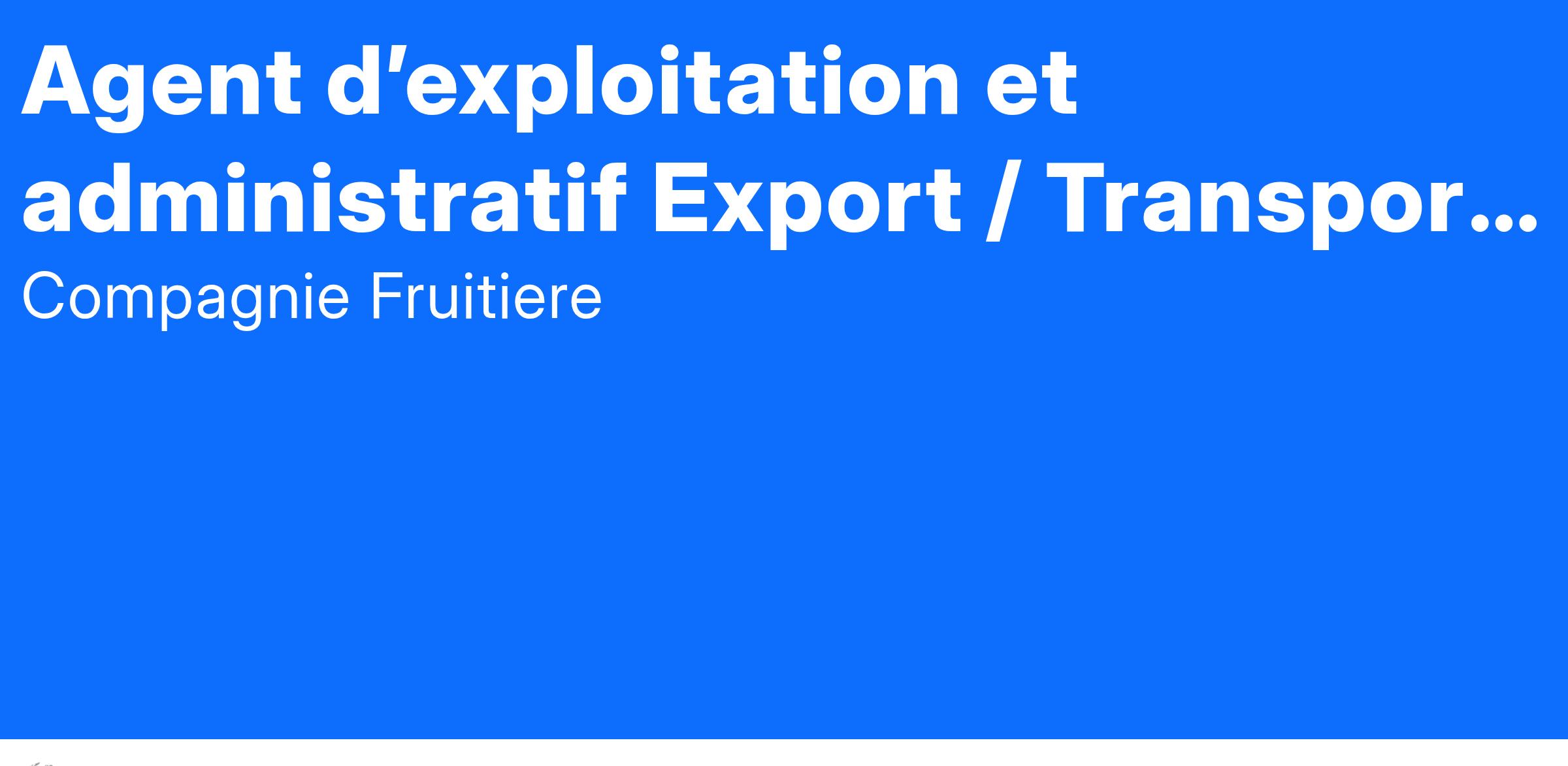 Dans le cadre d’un remplacement congé maternité, la société logistique du Groupe Compagnie Fruitière, TRANSIT FRUITS, est à la recherche d’un Agent d’exploitation et administratif Export / transport maritime (H/F) au sein du Siège à Marseille en CDD (5 mois, prolongeables).