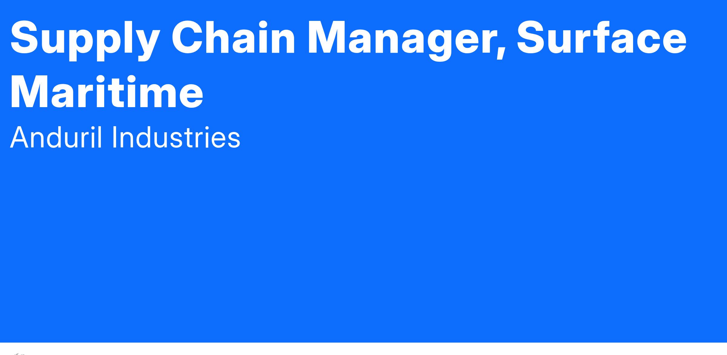 Anduril is seeking an experienced Supply Chain Manager to lead and manage all aspects for the Surface Maritime business line in the DC/NoVA area. A successful candidate will be responsible for developing and executing strategies that optimize value, quality, and delivery to support our manufacturing operations. This role involves strategic sourcing, supplier relationship management, cost reduction initiatives, and cross-functional collaboration to ensure the continuous supply of materials necessary for production.